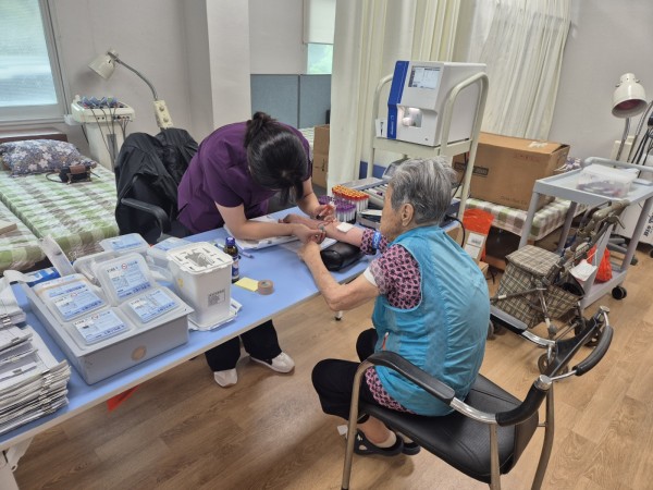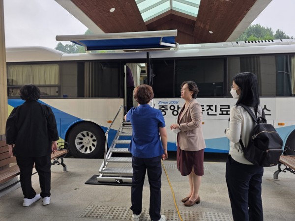대형버스에 X-ray 및 갑상선 초음파 검사를 할 수 있도록 설비가 되어 있어 센터 내에서는 신체 계측 및 혈액검사 등을 마친 후 이어서 할 수 있었습니다. 거동이 불편하고 건강이 불편한 어르신 대상으로 밝게 웃으며 진행해 주셔서 감사드립니다. 이날엔 질병관리청 결핵정책과 과장님 께서도 현장을 방문해 의로와 격려의 말씀을 전해 주셨습니다.